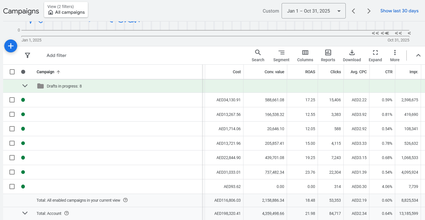 The account was structured around Performance Max, Search, and high-intent Shopping campaigns, supported by clean conversion tracking and value-based bidding. Budget allocation focused on revenue-driving SKUs, best-selling categories, and high-LTV audiences across the UAE.