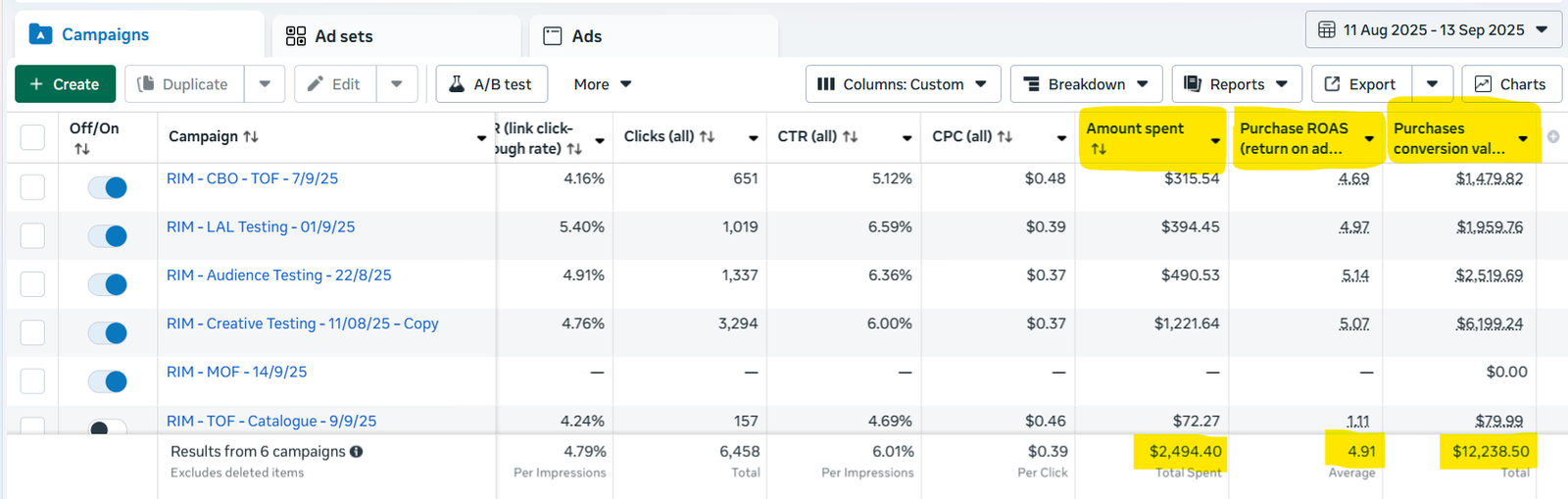 Maintained a strong ~4.9x ROAS across multiple campaigns